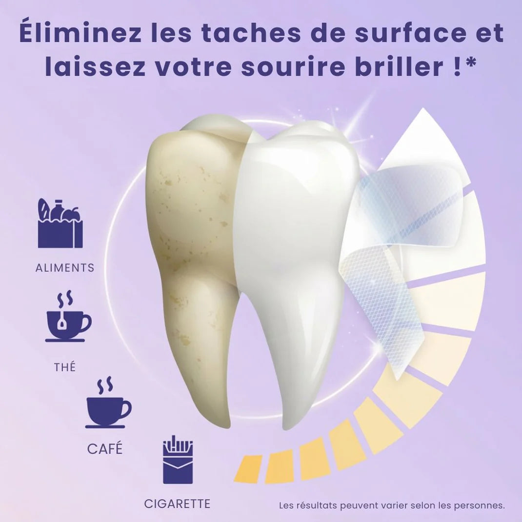 El café, el té, el vino tinto o el tabaco dejan manchas amarillas profundamente incrustadas en el esmalte. Las tiras SOIELYSSE™ utilizan una tecnología violeta correctora del color que neutraliza instantáneamente los tonos amarillos al retirarlas. El resultado: una sonrisa visiblemente más brillante en tan solo 30 minutos .